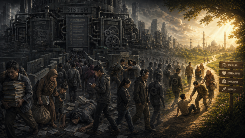 muslimx.id — Ketika masyarakat terus-menerus dihadapkan pada sistem yang rumit dan tidak ramah, dampaknya tidak hanya terasa pada aspek praktis kehidupan, tetapi juga pada cara berpikir dan kesadaran sosial. Fenomena rakyat dipaksa menyesuaikan sistem perlahan membentuk pola pikir bahwa kesulitan adalah hal yang wajar, bahkan harus diterima. Dalam jangka panjang, kondisi ini dapat mengubah cara masyarakat memahami hak, keadilan, dan peran negara.